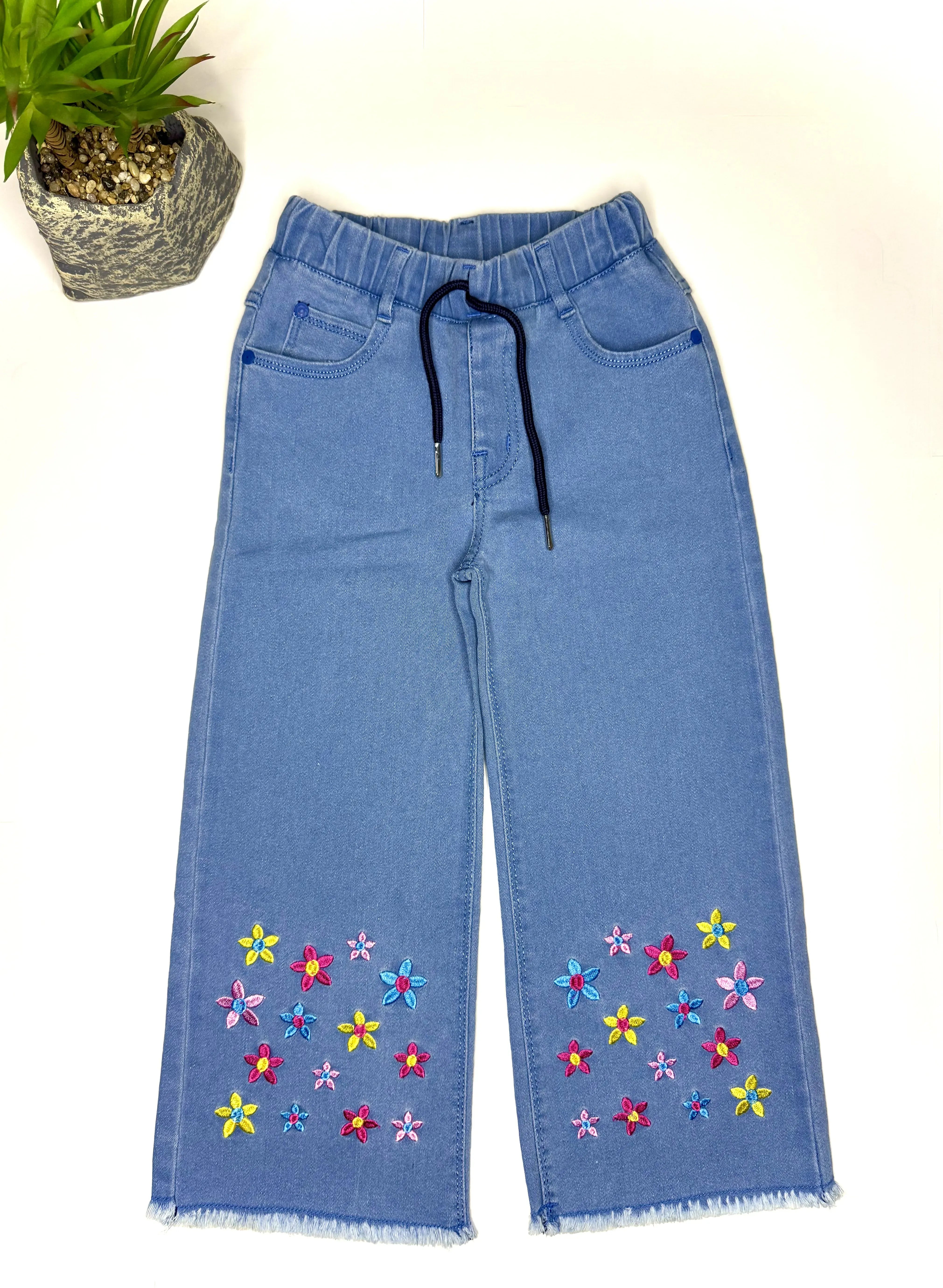 Style: Classic blue denim with flared legs and floral embellishments – perfect for casual outings or dress-up days