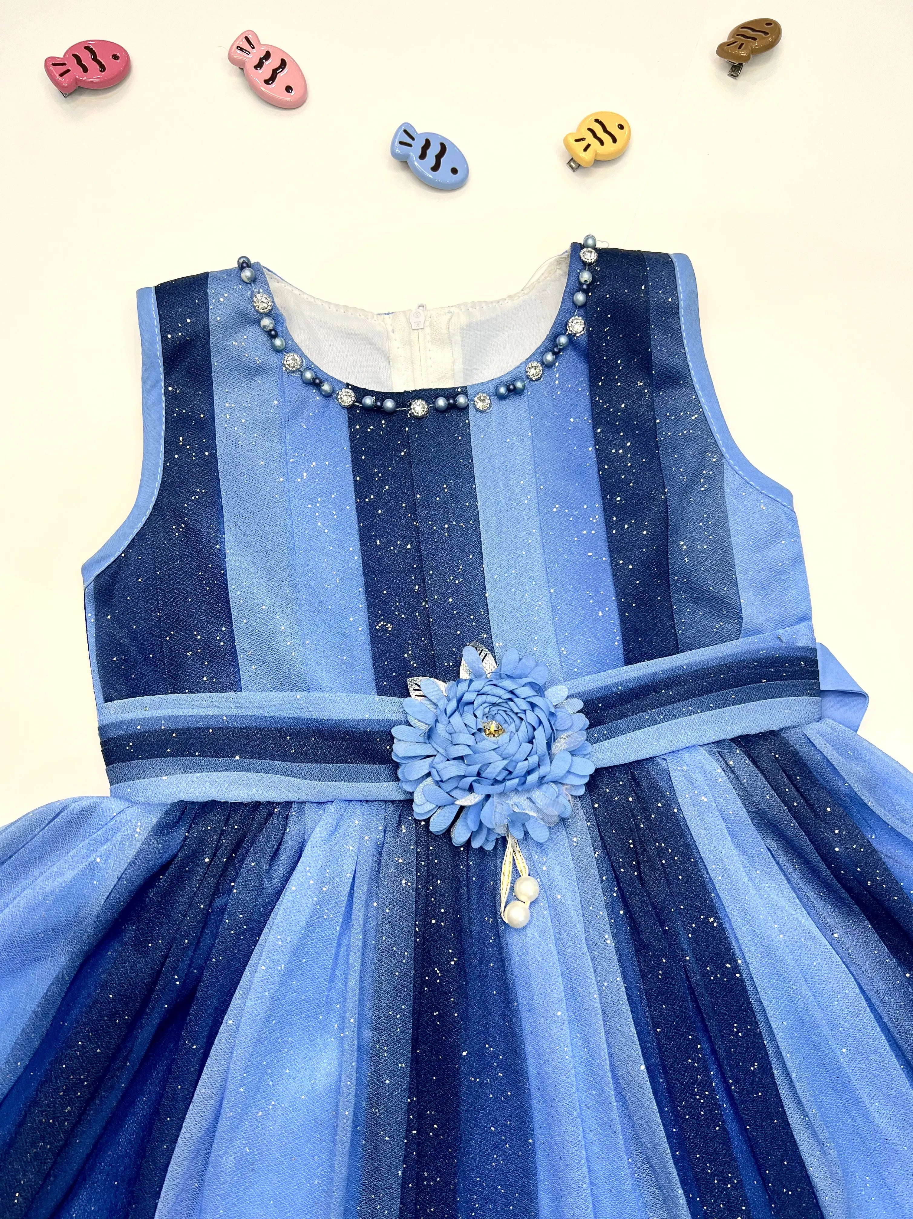 Let your little fashion star dazzle in the Shimmer Sparkle Glitter Blue Funky Frock, made from soft moonlight shimmer fabric that adds a touch of glam to every twirl. With a stylish design, matching trouser, and a soft inner lining for extra comfort, this outfit is perfect for parties, special occasions, and picture-perfect moments.
